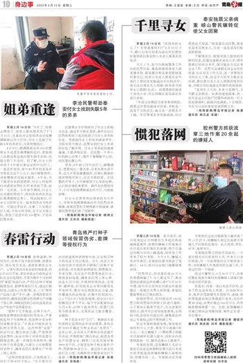2月9日,湘潭路派出所110民警梁永丰巡逻至湘潭路附近时,看到两人在路边焦急地向警车招手求助,民警立即下车询问。经了解,付女士的弟弟于5年前从泰安安阳外出打工,一直没有音讯,家中80多岁的老母亲非常思念这个小儿子,每日郁郁寡欢,身体健康状况越来越差。5年来,为了圆老母亲的团圆梦,付女士四处拜托亲戚朋友帮忙打听弟弟的下落,始终一无所获。今年春节期间,付女士在亲戚的帮助下,得知其弟弟在李沧区湘潭路附近务工。得此线索后,付女士立即和丈夫一起来到李沧寻找弟弟。可到达李沧后,夫妻二人发现茫茫人海,不知从何寻找,在手足无措之际,看到了巡逻中的110警车,于是向民警求助。