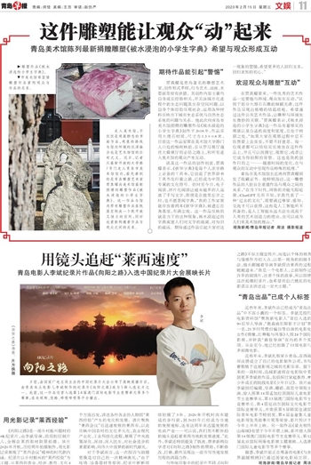 走入美术馆,不仅仅是观展静态的书画作品,观展的路线与馆内环境的沉浸融合也是艺术场馆的应有之义。近日,记者从最新开放的大学路7号门走入青岛市美术馆馆内,最先看到的是青岛雕塑艺术家贾真耀向美术馆最新捐赠的雕塑作品《被水浸泡的小学生字典》。这一作品与馆内原有雕塑作品在院落里构成一个既开放又独立的空间,同时也重新构建着作品与观众之间的关系。