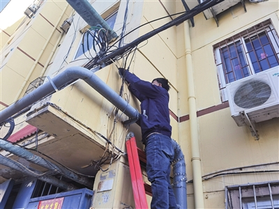 “这些楼院建成年代久远,不少居民家中更换过多次网线,每经一次更换,就会新增一条废线,多年下来,楼院线缆铺设愈发凌乱。分辨并剔除这些废线成了我们治理工作的一个难点。”徐兴峰告诉记者,为了最大程度减少失误操作,街道城管办积极邀请五大运营商来现场“把关”,对各自的废线进行排查,而后由施工队伍进行统一剔除和捆扎。