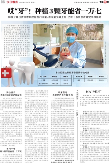 口腔种植牙一直以来是社会关注的热点,此前网上常有“单颗种植牙上万元”“一口种植牙,一辆小轿车”的说法,这也让口腔种植牙一度被贴上“昂贵”“奢侈”等消费标签。2月20日起,青岛市口腔医院在国家具体政策落地前主动作为,率先在岛城全面降低种植牙费用,实现了平均降价40%的巨大突破,让群众摆脱了高价种植牙的苦恼,堪称是最温暖人心的“民生礼包”。种植牙降价首日,记者来到青岛市口腔医院本部院区,了解到自降价消息发布以来,种植科门诊量、咨询量大幅上升,已经有十多位患者确定手术排期。
