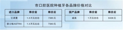 2月19日,青岛市口腔医院发布的消息让温红心头一喜——种植牙价格终于降下来了。于是她立马约了负责复查的种植科副主任医师王燕排期手术。“这一次,她另一侧的3颗牙可以一起种植,相较于之前威高的种植体价格在1万元左右,现在降价后价格是6436元,单颗种植体价格下降了近3600元。”王燕表示。收到这个利好消息的时候,温红表示:“再种植剩下的3颗牙时,我就可以选择进口品牌,像士卓曼、登士柏ASTRA每颗大致在7385元,没降价之前价格都在1.3万元左右。”