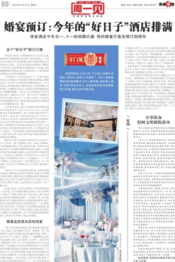 “春节过后前来看场地、询问婚宴相关事宜的人多了起来,周末接待几乎是一家接着一家。”蓝海御华大饭店市场部总监刘伦超介绍道,“现在一些‘好日子’,比如五一假期、十一假期期间,宴会厅基本都订满了,已经排到了2024年。酒店可用于婚宴的大厅有三个,可以单独使用,也可以打通使用。”刘伦超介绍,前来看场地的新人们主要咨询的问题包括宴会厅的装修、硬件配备如何,大厅是否方正,空间是否足够,周边交通是否畅通,停车是否方便等等,“比如我们酒店的优势就在于近处就有地铁口,对于私家车,我们有车梯,婚车可以通过车梯直接到宴会厅门口。另外我们的宴会厅挑高8.5米左右,可以容纳各种婚宴装饰。还有大家最关心的是菜品的品质,我们酒店是餐饮起家,菜品一直广受好评。”刘伦超说道。记者看到,蓝海御华大饭店的婚宴规格每桌有3699元、4299元、4699元等几个档次,据了解,大部分人会选择中等档次。“疫情几年,酒店人经历了‘至暗时刻’,一直艰难前行,等待着黎明时刻的到来。现在,酒店人终于迎来了春天,我们的坚守,将化作更高的服务品质,回馈到新人们的人生大事中。”