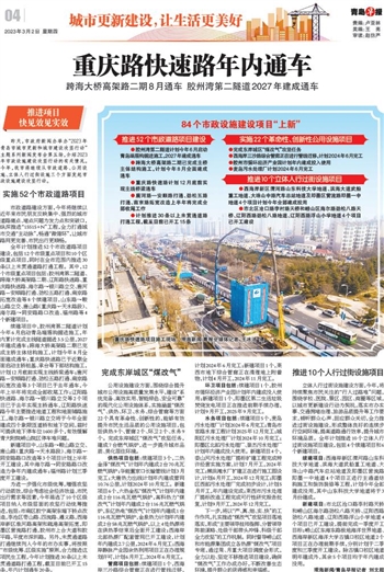 续建项目中,胶州湾第二隧道计划今年6月启动青岛端盾构掘进施工,年内累计完成主线隧道掘进3.5公里,2027年建成通车;跨海大桥高架路二期已完成主桥主体结构施工,计划今年8月全面建成通车;重庆路快速路已于近期全面启动主桥桩基、承台等下部结构施工,计划12月底前实现主线桥梁通车;唐河路-安顺路打通、劲松五路打通、南京路拓宽改造等3个项目已于去年通车,今年上半年将完成全部收尾工作;辽阳路快速路、海尔路—银川路立交等2个项目已于去年实现主桥通车,辽阳路快速路今年主要推进地道工程和地面辅路施工,海尔路—银川路立交将于今年全面建成四个象限匝道桥和地下空间,届时可提供地下停车位1600多个,有效缓解青大附院崂山院区停车难问题。