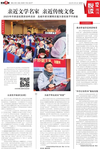 青岛市2023年全民阅读·作家进校园暨版权保护宣传活动于昨日在青岛市盲校正式启动,青岛市作协副主席、儿童文学作家刘耀辉应邀为盲校的孩子们进行了一场主题为“与少年朋友们谈亲近传统文化”的讲座。此次活动由青岛市文化和旅游局、青岛市文联、青岛日报报业集团主办,青岛早报、青岛市作家协会、青岛市盲校承办。