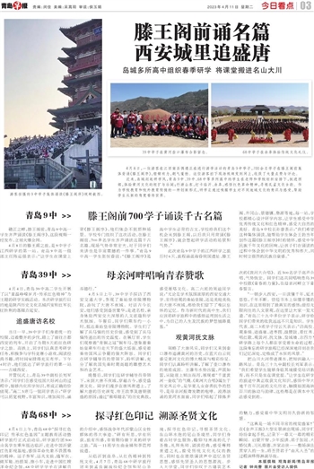 4月8日的滕王阁之旅,是9中学子江西研学的第一站。青岛9中高一级部主任陈运强表示:“让学生在课堂上背《滕王阁序》,他们体会不到那种场景。学校专门组织了这次活动,在滕王阁前,700多名学生齐声诵读这篇千古名篇,现场气势非常宏大,对于同学们来讲也是非常震撼的一件事。”青岛9中高一学生张恒睿说:“《滕王阁序》是高中学生必背的古文,学校给我们这个机会来到滕王阁,以后我只用背诵《滕王阁序》,就会想起研学活动的场景和气势。”