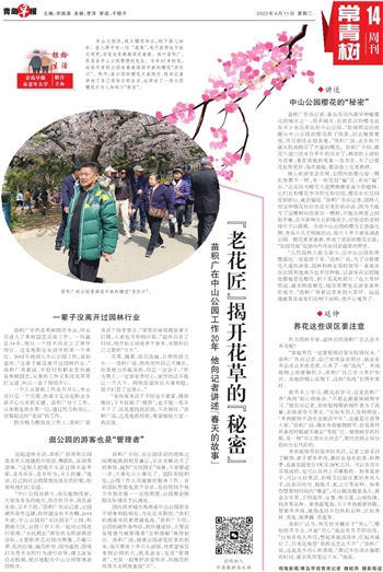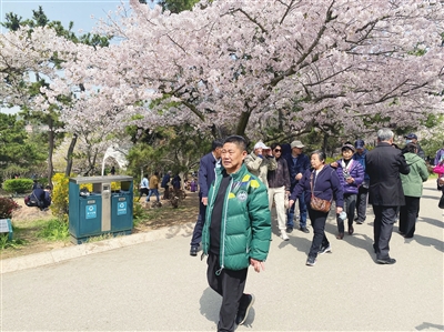 中山公园内,枝头樱花如云,树下游人如织。在人群中有一位 “游客”,他不拍照也不驻足观赏,而是这里瞧瞧那里看看。他叫苗积广,原青岛中山公园管理处处长。今年62岁的他,这些天常到公园来看看满园开放的樱花“老伙计”。昨天,在公园的樱花大道附近,他向记者讲述了自己退休后的生活,也讲述了一些公园樱花不为人知的小“秘密”。