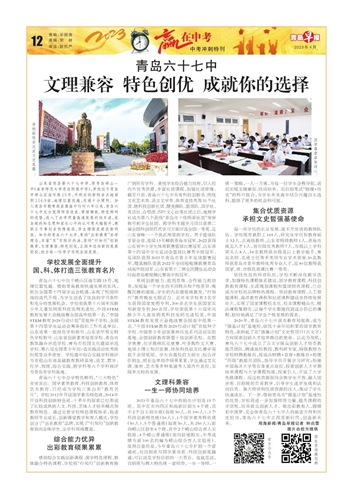 青岛六十七中办学特色鲜明,“三大特色”非常突出。国学素养教育、科技创新教育、体育艺术教育,已经成为学校三张出彩“教育名片”。学校2012年开设国学素养特色班,2014年开设科技创新特色班,十多年的探索已经形成了比较成熟的人文、科技、艺体人才培养模式和教育特色。通过完善学校特色课程体系,促进教师专业成长,创新课堂教学和育人模式,学校创立了“出彩教育”品牌,实现了“行知行”创新教育面向全体学生、全学科领域覆盖。