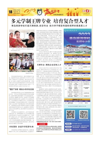 学校自1999年在山东省内率先开办了航空专业,帮助众多学生升入中国民航大学、山东师范大学、上海民航学院等知名高校深造。与国内外多家航空企业建立了合作关系,形成了辐射国内外、岗位多样化的实习实训和就业基地群。多年来一直是南方航空公司、东方航空公司、厦门航空公司等在省内的社会招乘点,是青岛胶东国际机场主要的实习生源基地。学校还与澳大利亚安格里斯学院、韩国仁荷工业专门大学、新西兰旅游学院等合作,为学生开辟了境外对口升学、就业的通道,较高的外语水平、国际视野和综合能力,增加了学生回国就业的竞争优势。