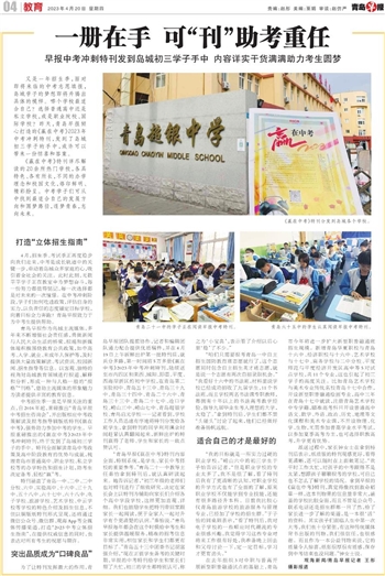 “青岛早报《赢在中考》特刊内容全面,特别系统,是学生、家长中考择校的重要参考。”青岛二十一中教导主任秦怡拿到特刊后,就认真研读起来。她告诉记者,“初三年级的老师们也对特刊进行了细致研究,决定在家长会上以特刊为辅助向家长们介绍各个高中学段学校,这样更加直观、详细。我们也鼓励学生把特刊带回家跟家长一起阅读,便于全家人一起对升学有个更清楚的认识。”秦怡说。“青岛早报每年都会在这个时候给中考生和家长提供温暖服务,精准的招考信息非常实用,相信家长和学生们都更有目标了。”青岛五十三中团委书记胡富强介绍,“现在正值学生备考的关键时期,早报的中考特刊给学生和家长们帮了大忙,初三的学生都特别认可,称之为‘小宝典’,表示看了介绍以后心里‘稳’了不少。”