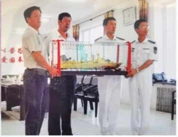 2001年,薛冰(左二)向部队赠送刻有“一帆风顺”字样的舰船模型。