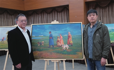鲍尔吉·原野(左)与插画家牛春光在书中插画作品展前合影。