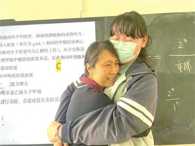 中午12点,随着下课铃声的响起,同学们为罗华老师献上鲜花、书信等礼物,并一一走上讲台与罗老师拥抱。“老师,您会给我们送考吗?”“老师,您辛苦了,我们一定好好发挥,不辜负您的希望”……在这个充满惊喜的拥抱环节,个头远远超过罗华的一名名同学与他们心中的“罗妈妈”拥抱,讲着温馨的“悄悄话”。
