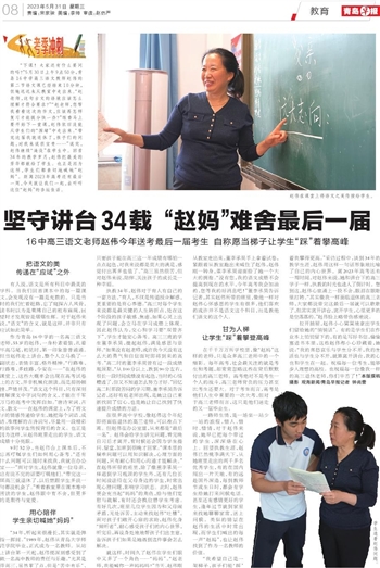 “下课!大家还有什么要问的吗?”5月30日上午9点50分,青岛16中学高三语文教师赵伟的第二节语文课已经结束10分钟,但她迟迟未从教室中走出来。“赵老师,这句古文的语境应该怎么理解才符合要求?”“赵老师,您帮我看看这次的作文,应该再怎样复习才能提分快一些?”眼看马上要开始下一堂课,赵伟依旧没能从学生们的“围堵”中走出来。“带完这届我就退休了,孩子们的问题,对我来说很宝贵……”说完,赵伟继续“淹没”在学生中。回首34年的教学岁月,赵伟把最美的芳华都献给了学生。也正是因为这样,学生们都亲切地喊她“赵妈”。距离2023年高考还有最后一周,今天就让我们一起,去听听这位“赵妈”的杏坛佳话。