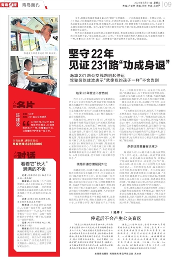 作为自开通起就在这条线路上运营的驾驶员,青岛城运控股公交集团231路驾驶员陈建波的心里满是不舍。“在这条线路上跑了22年,一年四季沿途所有的风景都见过,它就像我的孩子一样,看着它从‘出生’到‘长大’,陪伴着我一路护送乘客平安到家。”陈建波说。