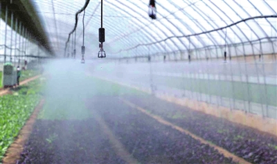 绿油油的小白菜一畦畦整整齐齐排列着,配备了微喷防滴器的十字雾化微喷头悬挂在温室上部3米高处,只见盛客隆现代农业基地经理樊俊京在手机智能云平台小程序点击了几下,立刻就有细雾状水花均匀地洒落,给菜叶挂上晶莹的水珠。“我们采用专家提供的新技术,把制作粉条时清洗、脱汁、分离后的水收集起来,添加微生物菌剂发酵后制成液体肥,用它浇菜环保又健康”。樊俊京一边操作设备,一边向记者介绍起这套喷灌系统。