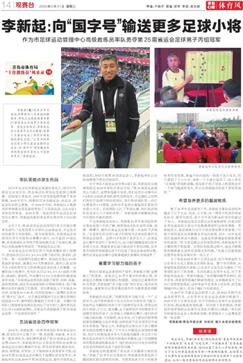 做了20多年足球青训工作,李新起为青岛足球培养输送了以于大宝、刘洋、王子铭、沙一博等为代表的国家队队员、国字号球员,弟子当中成为职业队球员的超过了50人。李新起还是亚足联认证的B级讲师,目前活跃在青岛足坛的大部分年轻教练都曾听过他的课程。李新起坦言,基层教练员对于中国足球发展非常重要,“目前中国的基层足球教练水平还比较低,而8—12岁是足球打基础的黄金年龄段。这就是我强调基层教练重要性的原因。”作为亚足联认证的B级讲师,李新起每年至少要给两个班授课。在带队和授课过程中,他也不断吸取和接收最先进的足球理念和风格,“我最大的愿望就是想多给青岛足球培养一些人才。”