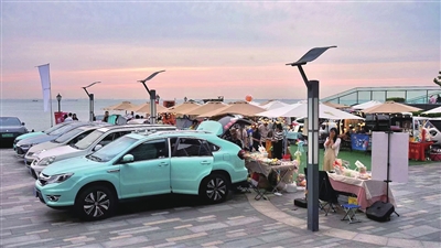 3日傍晚,落日后备箱市集热热闹闹地开集了。一辆辆轿车整齐停放,打开的后备箱便是“现成的货架”,各种饮料食品、手工饰品、文创产品、图册书籍,摆放得琳琅满目。还有一些游乐项目,有兴致的市民游客可以停下脚步,玩一玩、乐一乐。当夕阳落入大海,金色的光芒随着碧波荡漾,参集汽车的后备箱纷纷装饰上灯串、插上小旗子,很有海滨夏日的氛围感。