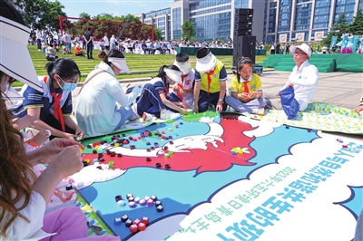 2023年世界环境日青岛主场活动上,小学生们用收集的1000个塑料瓶瓶盖拼出卡通地球形象艺术作品。