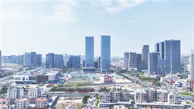 早报6月5日讯 观海亭上凭阑坐,一湾碧蓝抱远山。在青岛东部金融区内,两栋超200米的“中国塔”造型超高层建筑交相辉映,作为崂山区第一高楼,青岛国际啤酒城改造项目T1T2楼工程即将全面投入使用。