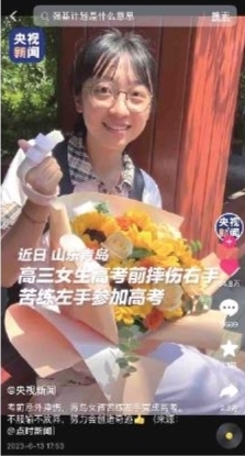 在央视新闻视频平台中,“青岛高三女生考前摔伤右手,苦练左手参加高考”的视频在昨天下午5时53分一经发布,瞬间引发网友关注,截至记者昨晚10时发稿,浏览量达到34万+,网友评论近5000条。