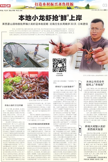 昨天,从莱西市姜山镇传来好消息:端午节前,青岛市民能吃到本地生态养殖的小龙虾了。据介绍,4月下旬,35万斤从江苏盱眙引入的小龙虾苗首次“入住”姜山湿地,成为生物链条中的新成员。这些来自盱眙的小龙虾苗在优美的自然生态环境里生长了两个月后,迎来收获期。昨天,记者实地探访了解到,这是姜山湿地历史上首次引进小龙虾养殖产业,预计今年总产量将超过200万斤。
