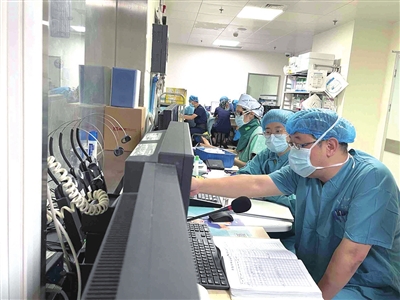 此时记者隔着玻璃屏幕可以看到,手术台上已有两位专家正在为一位复杂病情的患者进行冠脉介入手术。“介入手术,是在不开刀的情况下精准治疗病灶的手术。医生通过在皮肤上做直径几毫米的微小通道,经血管在导管引导下直接对病灶精准打击,就像导弹一样。精准、微创,都是它的优势。”在一扇玻璃隔着的手术室外间,王松涛一边在电脑上观看手术进程,一边告诉记者:“一台手术,台上有直接具体操作的专家,台下还有医护团队在共同努力,有护士及时观察用药情况,有技师随时准备指导特殊器械的使用,还有多个医生共同讨论手术方式策略等,共同决定最优的介入手术方案。”