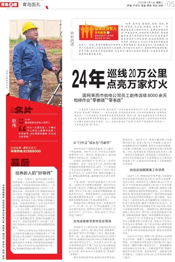 “国网山东省电力公司青岛供电公司上合组织青岛峰会电力保障先进个人”“莱西市见义勇为模范”“国网莱西市供电公司先进工作者”……从部队到地方,赵伟用奉献和创新书写青春,用热爱和执着铸就人生。参加工作24年来,赵伟始终坚守在一线,用熟练的技能点亮万家灯火。