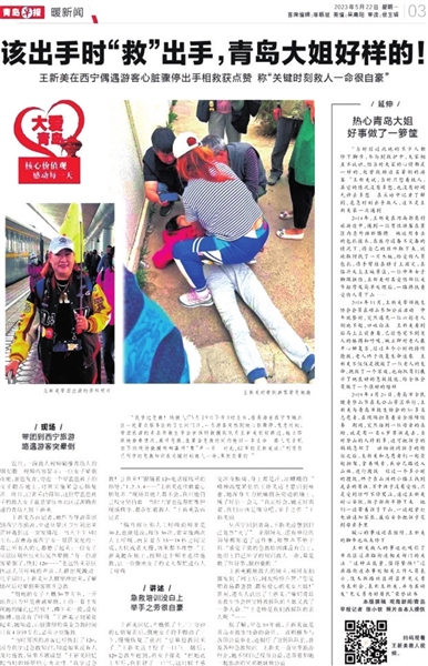 王新美在危急时刻挺身而出的义举,不仅为心脏骤停的女士争取到了宝贵的时间,也深深打动了现场的群众。据了解,早在10年前,王新美就是青岛市救生协会的会员,一直积极参与各项公益事业,还担任了宣传队队长,普及各种急救知识。王新美一直从事旅游行业,她不仅自己投身公益,还带着和她一起旅游的兄弟姐妹做公益。