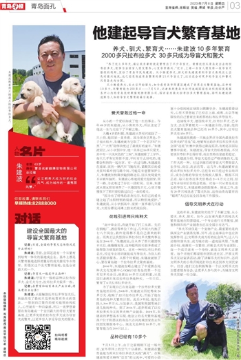 朱建波:从接触到拉布拉多导盲犬后,我就改变了最初只是单纯喜欢养犬的想法。一想到自己繁育的爱犬能帮助残疾人,心里就有一种自豪感,所以一直梦想着要在青岛建成一个全国最大的导盲犬繁育基地,让更多优质的拉布拉多犬成为导盲犬或警犬,让更多盲人享受导盲犬的服务。