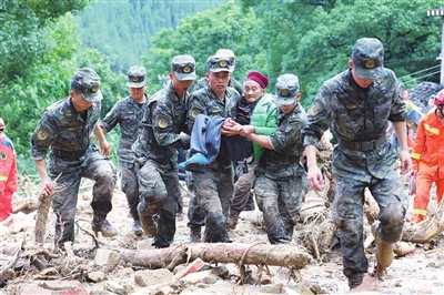 7月4日,在重庆市万州区长滩镇,武警官兵在转移被困群众。新华社发