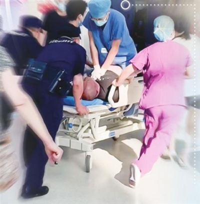 迟一勋跳上急救平车给病人做心肺复苏。 视频截图