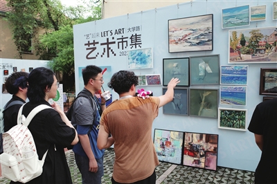 与艺术市集的不期而遇,成为大多来青游客的新惊喜。保定游客展琬璐一路行走一路兴奋,一边跟同伴说着“手机内存不够用了”,一边不停地在每个摊点前驻足、拍照,而与市集摊主的攀谈则是她逛市集之余的主要收获,“所谓面朝大海,春暖花开,从海边一路走过来,这里不仅有绝佳的自然风光,文化气息也特别浓厚,特别是这些本土艺术家用他们的艺术主张表达着他们对于城市的态度,同时也在塑造着城市的艺术形象,这是比自然风物更让人心动的地方。”西安游客杜女士也表示,青岛老城区的建筑处处透露着老洋房的色彩,“让我感觉青岛人民的生活特别惬意,这次偶遇的艺术市集更是这种城市气质的注解,这里的艺术与现代和古典融合在一起,所谓的‘大学’,是融合了艺术和生活的现实,可感知,可沉浸。”