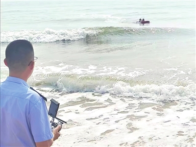 早报7月23日讯 7月23日上午,在青岛西海岸新区琅琊台龙湾附近海边,一名女游客被海浪推向远处,无法返回。紧急时刻,青岛市公安局海岸警察支队琅琊台派出所民警使用水上救援机器人,成功将女游客救回。