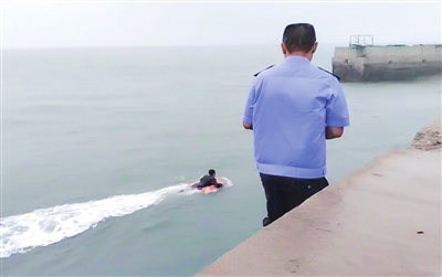 海岸警察支队王哥庄派出所巡逻民警杨帆介绍,当时正值涨潮,两名男子在离岸10多米远的海中呼救,海水不时没过两名男子的头顶,而且天上还下着雨,两名男子呼救声音越来越弱,大浪打在他们身上,随时可能发生危险。“看到情况紧急,我们迅速安排水上救援机器人出动,并操控水上救援机器人冲到两人身边,分别指导他们抓住把手,然后挨个救上岸边。”