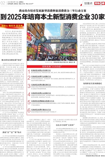 8月9日,青岛市政府新闻办召开新闻发布会,发布《青岛市培育发展新型消费释放消费潜力三年行动方案(2023—2025年)》(以下简称《三年行动方案》)。到2025年,全市将创建具有青岛特色的标志性新型消费应用场景30个,培育本土新型消费领先企业30家,实物商品网上销售额占社会消费品零售总额比重达到35%。