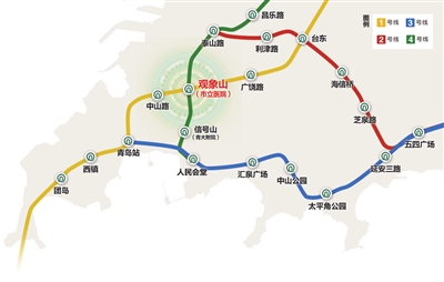 观象山(市立医院)站为地铁1号线和4号线的换乘站。其中,1号线的观象山(市立医院)站已启用A、C出入口,4号线的E、D出入口未启用。目前,各方正在加紧施工,力争早日建成投用。