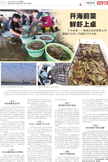 对于爱吃海鲜的岛城市民来说,大虾是餐桌上的常见菜品。通过科研人员的不懈努力,如今,中国对虾已经培育出多个新品种。种苗是水产养殖产业里的“芯片”,没有好的种苗难有高的产量。青岛集聚了中国海洋大学等一批涉海高校,在对虾育种领域展现出了强大的科研力量。南美白对虾作为岛城养殖量最大的对虾,此前的种虾一直依靠进口,价格昂贵不说,还不得不买。通过多年科研攻关,国产南美白对虾种苗研究不断取得突破。目前国内认定的12个南美白对虾新品种,仅黄海水产研究所就占有两个。而在传统的中国对虾领域,青岛的科研力量更是独占鳌头,目前,国内认定的中国对虾品种共有5个,全部是由黄海水产研究所选育。本版撰稿摄影 观海新闻/青岛早报记者 康晓欢