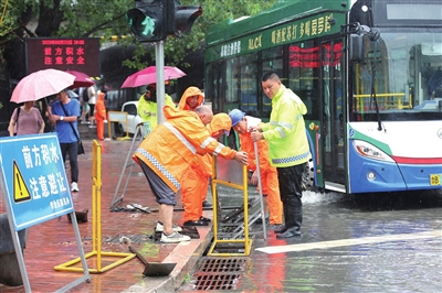 李沧区市政工作人员加速排水。观海新闻/青岛早报记者 杨博文 摄