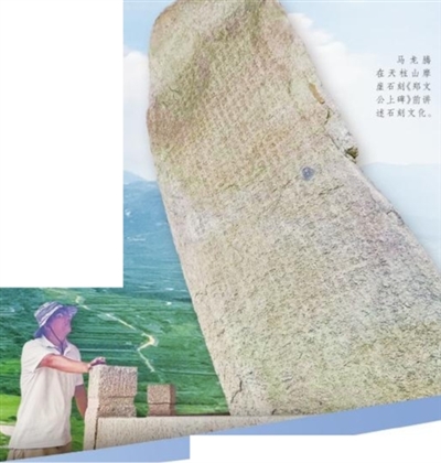 马龙腾在天柱山摩崖石刻《郑文公上碑》前讲述石刻文化。