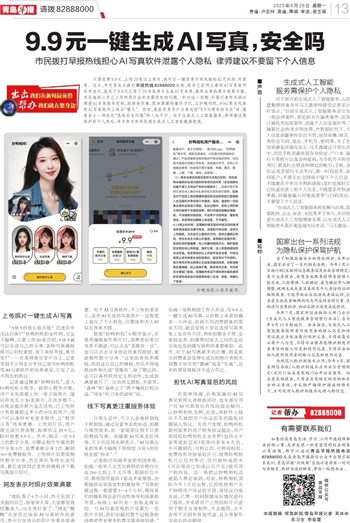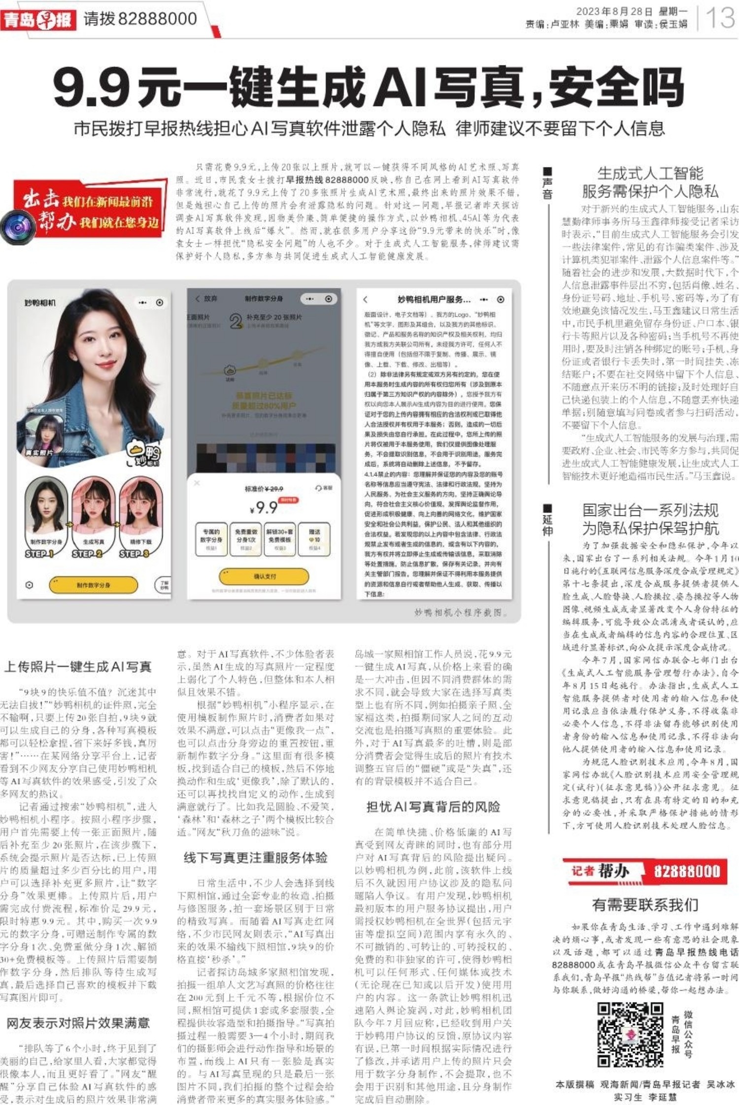 只需花费9.9元,上传20张以上照片,就可以一键获得不同风格的AI艺术照、写真照。近日,市民袁女士拨打早报热线82888000反映,称自己在网上看到AI写真软件非常流行,就花了9.9元上传了20多张照片生成AI艺术照,最终出来的照片效果不错,但是她担心自己上传的照片会有泄露隐私的问题。针对这一问题,早报记者昨天探访调查AI写真软件发现,因物美价廉、简单便捷的操作方式,以妙鸭相机、45AI等为代表的AI写真软件上线后“爆火”。然而,就在很多用户分享这份“9.9元带来的快乐”时,像袁女士一样担忧“隐私安全问题”的人也不少。对于生成式人工智能服务,律师建议需保护好个人隐私,多方参与共同促进生成式人工智能健康发展。