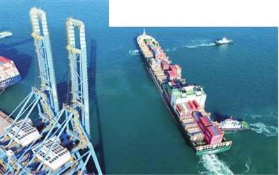 在山东港口青岛港全自动化集装箱码头,开往南非开普敦港的长献轮缓缓离泊。张进刚 摄