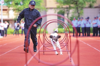 活动现场人头攒动,宾川路小学的师生们兴趣盎然,观看李沧特巡警大队民警的应急演练。随后,警犬基地训导员与小学生互动,带领警犬进行了搜索毒品、翻越障碍表演,并现场模拟了一次警犬抓捕“歹徒”的实战演练。