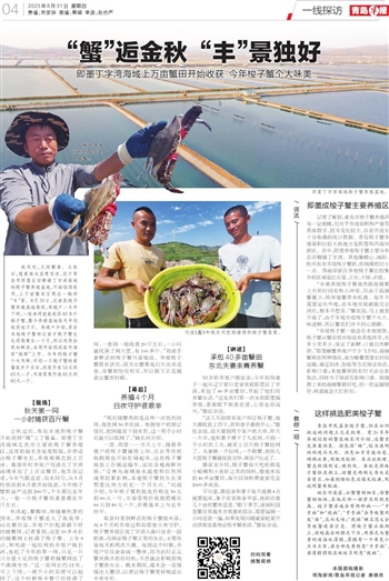 52岁的养殖户滕征余,今年初和妻子一起从辽宁营口老家来到即墨区丁字湾,承包了40多亩蟹田,开始了他们的养蟹生活。“这是我们第一次来到即墨搞养殖,看着眼下收获在望,心里也很高兴。”滕征余说。