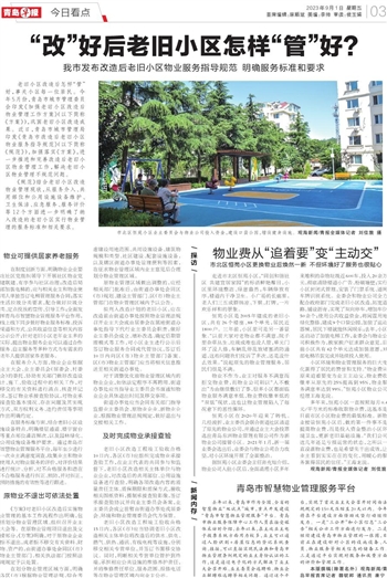 在制度创新方面,明确物业企业要在社区党组织领导下开展社区物业党建联建、有序参与社区治理;改造后局部加装电梯的,应与相关业主和物业使用人单独签订电梯管理服务合同;落实生活垃圾分类要求,配合做好垃圾分类、定点投放的宣传、引导工作;全面发挥青岛市智慧物业管理服务平台作用,线上线下同步做好物业服务标准、投诉渠道和方式、公共收益信息等相关内容公示公开;针对老旧小区老年业主多的实际,提出物业服务企业可以通过合作服务、自主服务等多种方式为有需求的老年人提供居家养老服务。