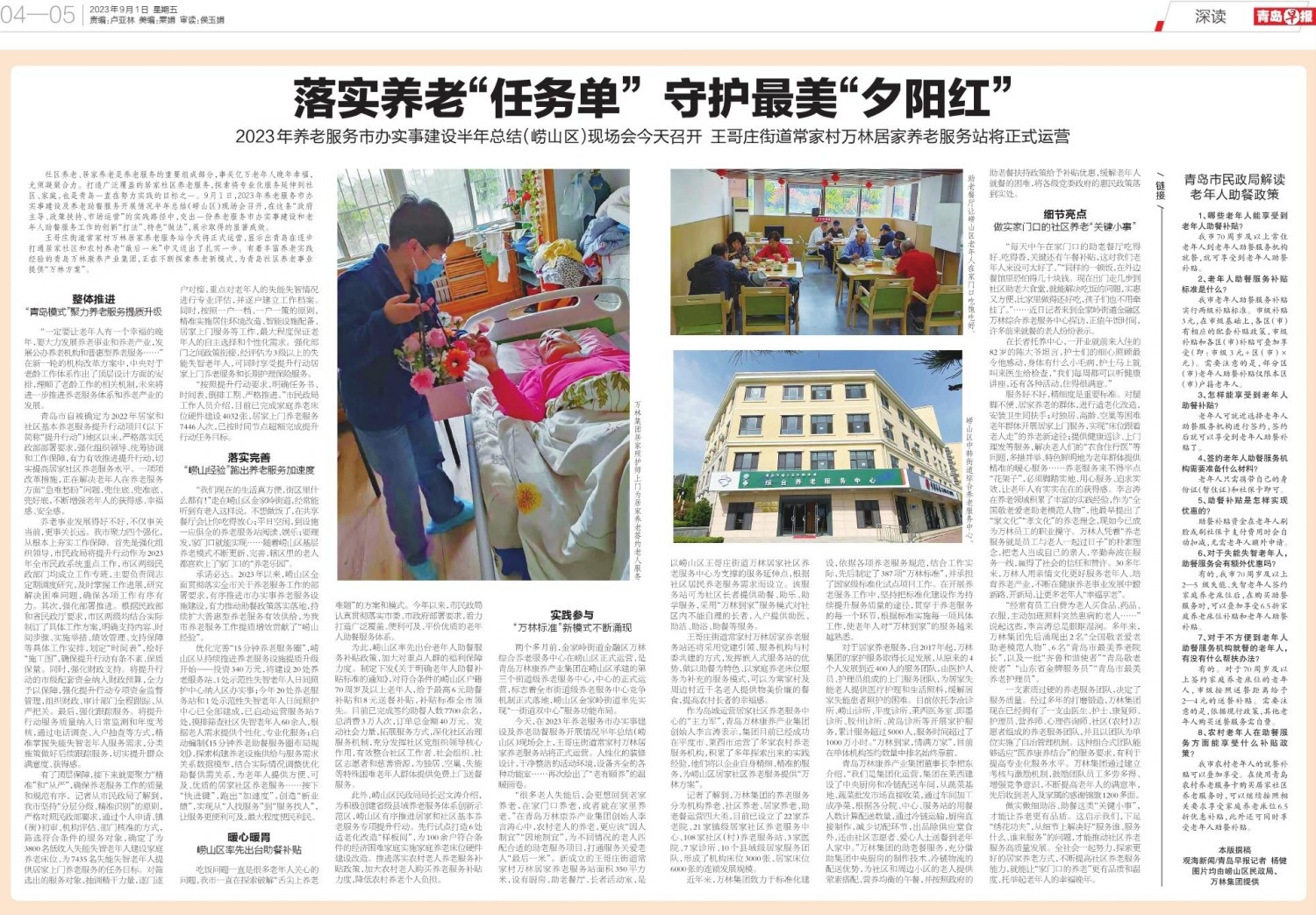 作为岛城运营居家社区养老服务中心的“主力军”,青岛万林康养产业集团创始人李言涛表示,集团目前已经成功在平度市、莱西市运营了多家农村养老服务机构,积累了多年探索出来的实践经验,他们将以企业自身精细、精准的服务,为崂山区居家社区养老服务提供“万林方案”。