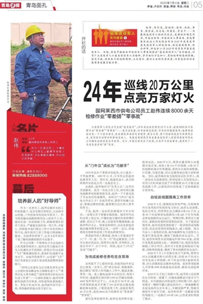 从退役军人到电力行业的“技术能手”,24年来巡线里程约20万公里,连续8000余天检修作业“零差错”“零事故”……他灵活处置,科学绘制巡线图,节约时间提高效率;他带领班组攻克一个个技术难关,把在部队养成的吃苦耐劳、顾全大局、勇于创新的优良作风带到企业,用实际行动带动和影响身边人。参加工作24年来,赵伟始终坚守在一线,用实际行动点亮万家灯火。