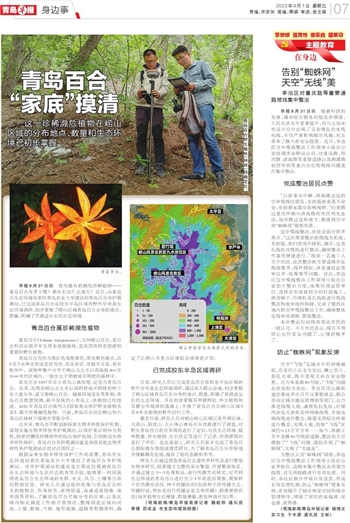 早报8月31日讯 青岛独有的濒危珍稀植物——青岛百合有多少棵?都生长在什么地方?近日,由青岛市生态环境局委托青岛农业大学建设的青岛百合养护观测站,已完成青岛百合在胶东半岛区域的野外分布及生态环境调研,初步掌握了崂山区域青岛百合分布的地点、数量,明确了其最适生长的生态环境。