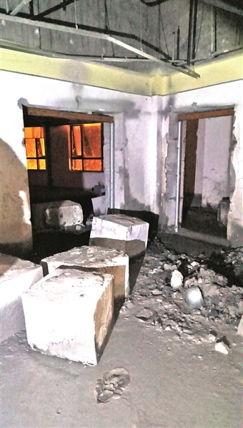 图左为网点房内被砸挖出洞口的剪力墙面。