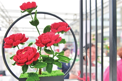 非遗技艺菏泽手工钩织的牡丹栩栩如生。 观海新闻/青报全媒体记者 邢志峰 摄