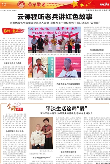 今年以来,青岛市军休干部志愿宣讲团进部队、机关、学校、社区等开展“六进”活动28次,受众21万余人次,为助力强军梦想提供有力思想保证、精神动力和文化支撑,让军休干部成为“讲”的主力,青少年成为“学”的主角,讲好“红色故事”,传播“红色声音”。下一步,青岛市军休服务中心将继续联合崂山区教育和体育局充分发挥军休干部志愿宣讲团作用,落实立德树人根本任务,为党培养更多堪当重任的时代新人。通讯员 游潇 摄影报道